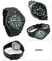 Sporty watch featuring bi-directional bezel, day/date window, and black dial with bright green indicies and luminous hands.